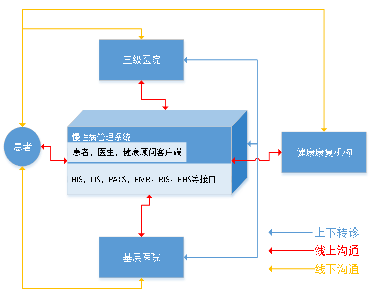 去医院确认,建立管理档案,将患者资料(电子病历、影像、生化参数报告、医嘱)导入到线上。如病情严重/检查不出来,转入上级医院进行治疗。病情稳定后转到下级医院或回家休养,后续沟通跟进,均可在网上进行。